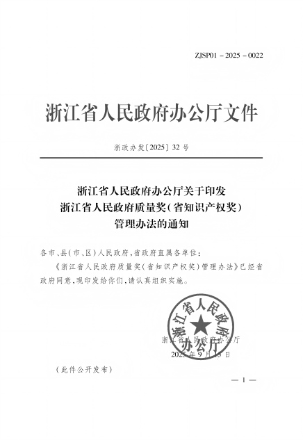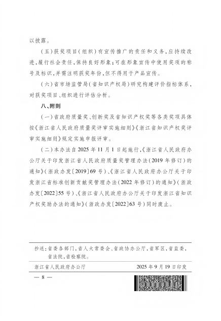 《浙江省人民政府质量奖管理办法》自2025 年11月1日起施行,《浙江省人民政府办 公厅关于印发浙江省人民政府质量奖管理办法(2019年修订)的通知》(浙政办发〔2019〕69号)废止。