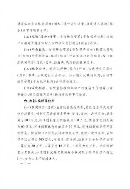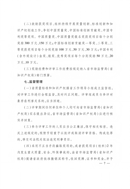 ★奖 励:获奖项目(组织)由浙江省政府进行表彰,并以适当形式向省 政府质量奖、创新奖获得者颁发奖牌、证书,发放一次性奖金: