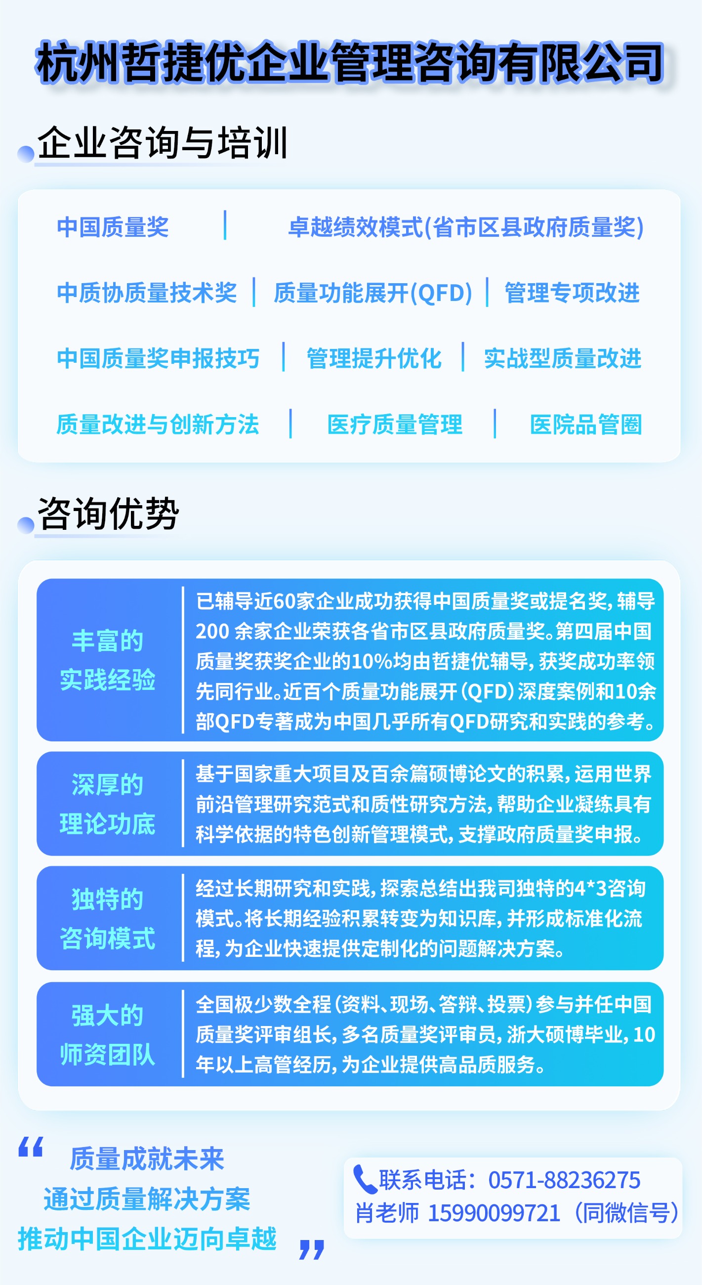 哲捷优咨询团队基于长期理论研究积累和丰富成功经验,传授质量模式凝练方法和申报技巧,若您希望了解更多政府质量奖申报策略与卓越绩效管理模式导入的资讯,欢迎联系哲捷优咨询专业团队。