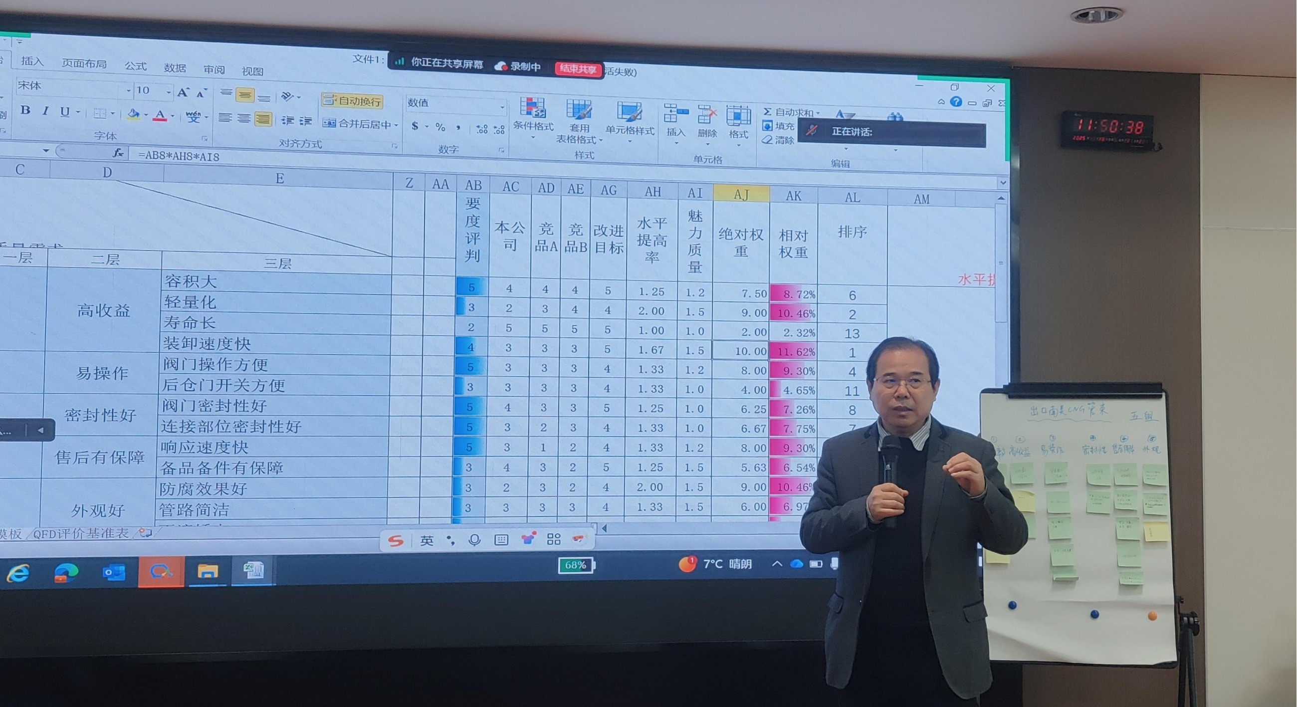 尤为突出的是,本次培训采用“理论精讲+分组实战演练+成果发表点评”的创新教学模式。学员在专家指导下,以实际工作场景为课题,亲历了从需求挖掘、分析、规划到质量屋构建的全过程。这种“做中学”的方式极大地深化了理解,提升了团队运用QFD工具解决复杂问题的协同能力。